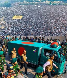 সকালে গুলশানের বাসভবন ফিরোজা থেকে রাষ্ট্রীয় মর্যাদায় খালেদা জিয়ার মরদেহ আনা হয় মানিক মিয়া অ্যাভিনিউয়ে। সেখানে সকাল থেকেই নেমে আসে শোকার্ত মানুষের ঢল। ভোর থেকেই লাখো মানুষ অবস্থান নেয় জাতীয় সংসদ ভবনসংলগ্ন এলাকায়। সময় বাড়ার সঙ্গে সঙ্গে জনস্রোত রূপ নেয় জনসমুদ্রে। দেশের বিভিন্ন প্রান্ত থেকে ট্রাক, বাস, ট্রেনযোগে ছুটে আসেন সাধারণ মানুষ ও নেতাকর্মীরা। কারও হাতে কালো ব্যাজ, কারও চোখে অশ্রু—সবার বুকে একটাই বেদনা, একজন আপসহীন দেশনেত্রীকে হারানোর শোক।