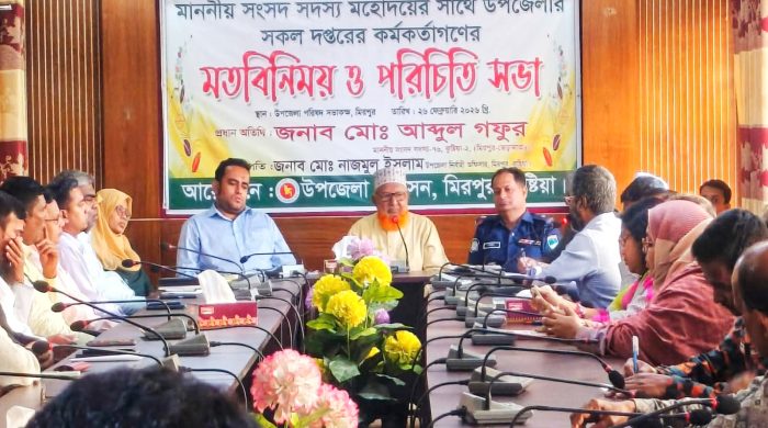 কুষ্টিয়া-২ (মিরপুর-ভেড়ামারা) আসনের সংসদ সদস্য আব্দুল গফুর এর সাথে মিরপুর উপজেলার সরকারি কর্মকর্তাদের মতবিনিময় অনুষ্ঠিত হয়েছে। বৃহস্পতিবার (২৬ ফেব্রুয়ারী) সকালে মিরপুর উপজেলা পরিষদ সভাকক্ষে মতবিনিময় সভা অনুষ্ঠিত হয়। উপজেলা নির্বাহী
