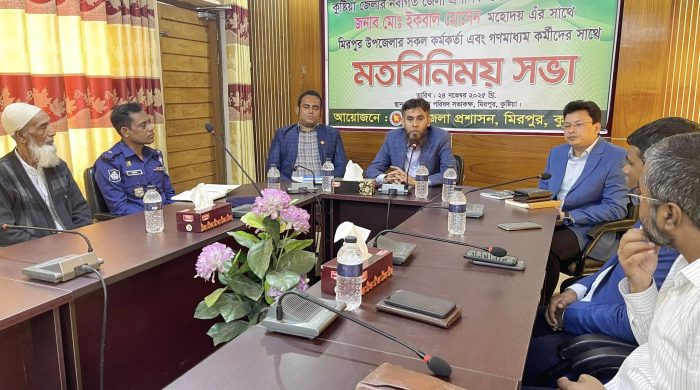 কুষ্টিয়ার মিরপুরে উপজেলার প্রশাসন ও গণমাধ্যম কর্মীদের সাথে মতবিনিময় করেছেন নবাগত জেলা প্রশাসক মোঃ ইকবাল হোসেন। সোমবার সোমবার (২৪ নভেম্বর) সকাল সাড়ে ১০টায় উপজেলা সম্মেলন কক্ষে উপজেলা প্রশাসনের আয়োজনে এ