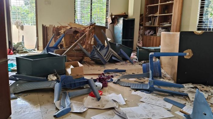 কুষ্টিয়া শহরের মজমপুর গেটে প্রথম আলো অফিসে হামলা ও ভাঙচুরের ঘটনা ঘটেছে। বৃহস্পতিবার (১৮ ডিসেম্বর) দিবাগত রাত দেড়টার দিকে বিক্ষুব্ধ জনতা অফিসটিতে ঢুকে সাইনবোর্ড, একটি কক্ষের দরজা-জানালা এবং বিভিন্ন আসবাব