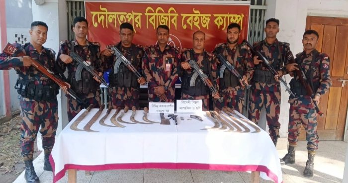 আসন্ন ত্রয়োদশ জাতীয় সংসদ নির্বাচনকে সামনে রেখে কুষ্টিয়ার দৌলতপুর সীমান্তে বিশেষ অভিযান চালিয়ে বিদেশি পিস্তল, গুলি ও বিপুল পরিমাণ দেশীয় ধারালো অস্ত্র উদ্ধার করেছে বর্ডার গার্ড বাংলাদেশ (বিজিবি)। মঙ্গলবার (১০