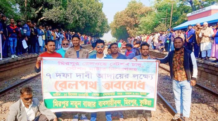 স্টেশন মাস্টার নিয়োগ সহ সাত দফা দাবি আদা‌য়ে কুষ্টিয়ার মিরপুর উপ‌জেলায় রেলপথ অবরোধ করা হ‌য়ে‌ছে। সোমবার (১৫ ডিসেম্বর) সকাল সাড়ে ৯টা থে‌কে মিরপুর উপ‌জেলা উন্নয়ন ক‌মি‌টির উদ্যোগে এই কর্মসূচিতে বিভিন্ন